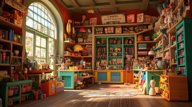 The playful room is lively with scattered toys and a vivid rocket ship. This image captures the essence of childhood joy and creativity. It highlights a fun play space. Generative AI