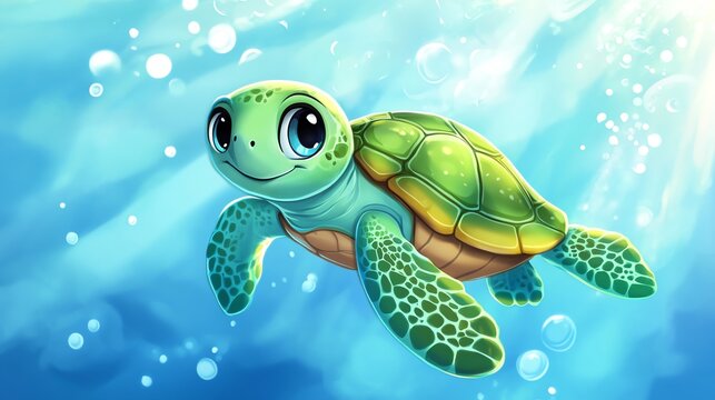 cheerful cartoon style turtle slowly crawls with friendly expression, showcasing its vibrant green shell and playful demeanor. This delightful character embodies sense of joy and curiosity