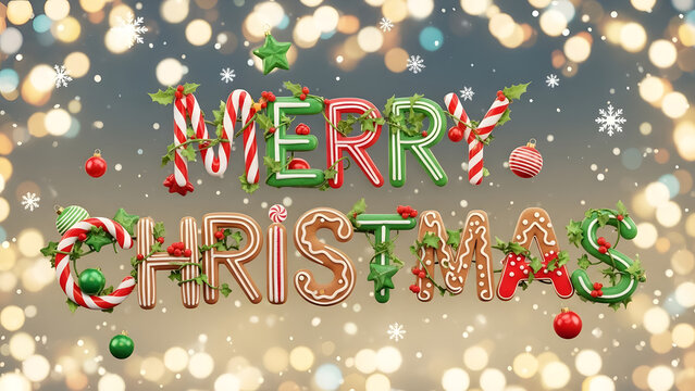"Merry Christmas" lettering made from candy and bokeh background