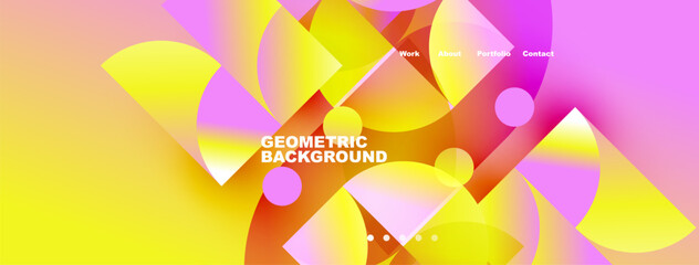 Abstract geometric background features vibrant yellow, pink hues. Text displays Geometric Background, navigation options present. Modern design.