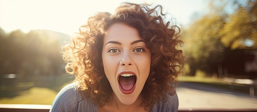 Woman on outdoor background playfully sticking out her tongue towards the camera with copy space image