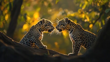 A young jaguar playfully interacting with its sibling in the wild, their eyes bright and curious.