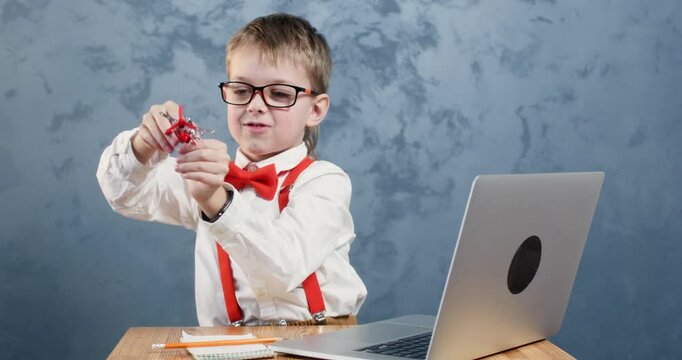 Cheerful schoolboy with bow tie lands toy plane on laptop. Studious boy in glasses playfully guides miniature aircraft onto computer keyboard