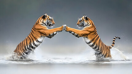 Two tigers playfully sparring in shallow water, misty forest background; ideal for wildlife documentaries or nature publications