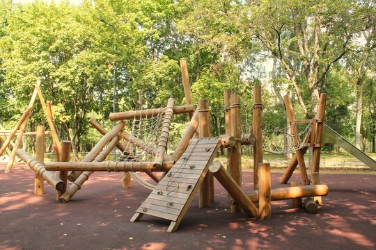 Whimsical Illustration of a Vibrant Playground with Diverse Play Structures and Lush Greenery for Child-Friendly Fun