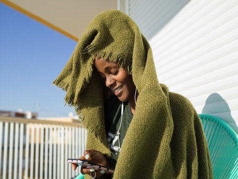 Female in earphones listening to music