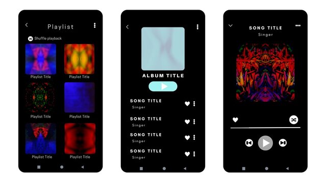 Mobile music player interface. Podcast turntable template. Audio streaming service layout. Profile, Album, Song, Singer, blog mockup. Apple music, deezer, spotify screen. Vector illustration.