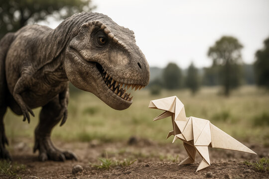 Tyrannosaurus rex meeting an origami tyrannosaurus rex in a field