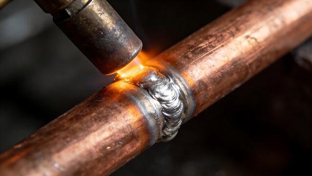 accuser. Extreme close-up of copper pipe joint with molten silver brazing. safety posters, maintenance manuals, designed for precision metalworking and fabrication facilities.