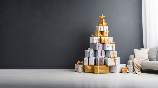 Happy loving young beautiful couple exchanging gift boxes for Christmas, new year or saint Valentine's Day. Man and woman in casual clothes holding presents, smiling, enjoying holidays at home
