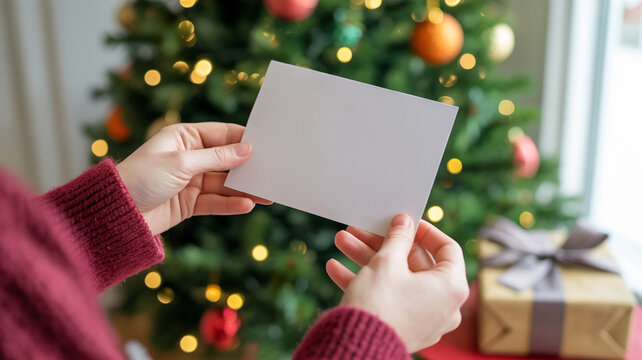 Hands exchanging a Christmas gift wrapped in brown paper with a small pine tree on top surrounded by other gifts and fairy lights.