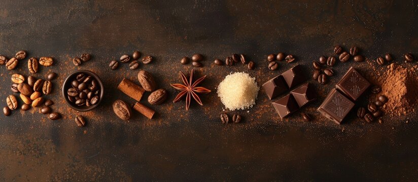 An aesthetically pleasing composition featuring a variety of elements such as coffee beans, chocolate, brown sugar, and star anise laid out on a backdrop with copy space, photographed from above.