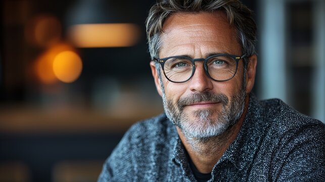 A smiling man with glasses enjoying a cozy indoor setting, capturing a moment of warmth and relaxation during daytime