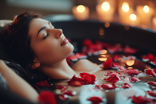 Close-up of a beautiful, sensual woman relaxing in a black tub with red rose petals floating on it. Valentine's Day pleasure