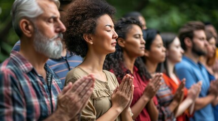 A diverse group of people of different ages and backgrounds, standing together with hands over hearts, pledging allegiance to the American flag, showcasing inclusive American pride