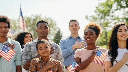 A diverse and multicultural group of American citizens pledging allegiance to the USA flag with hands on their hearts.