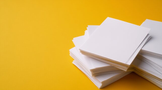 Stacked white paper sheets on bold yellow background, organized and plentiful