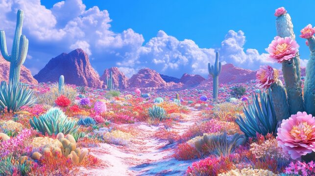 A vibrant and imaginative desert landscape filled with colorful plants, cacti, and blooming flowers under a bright blue sky. The terrain features a winding path leading through a plethora of vivid flo