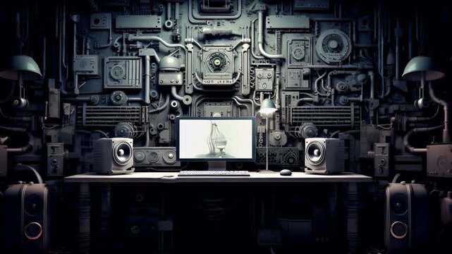 Digital art wallpaper background. A detailed, steampunkinspired room with a central desk and computer setup. The desk is surrounded by a plethora of intricate machinery and pipes.