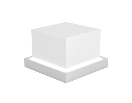 Modern white cube pedestal with a twotiered base and soft glowing ambient light.