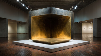 Geometric brass-framed cube sculpture on white plinth with blank header space