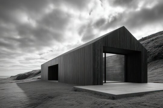 Minimalist barn set on raised plinth long sidelight with high shadow contrast across metal-clad walls sharp terrain shadows