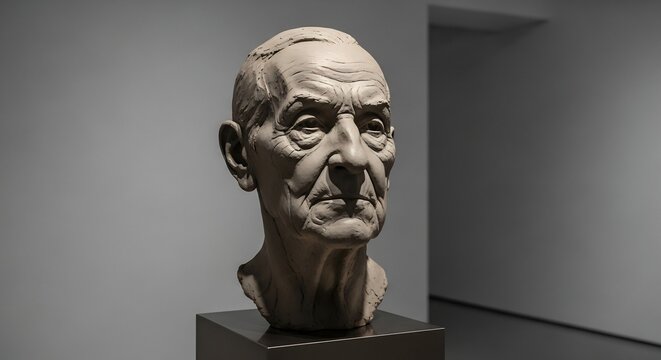 Clay bust of an elderly man on a metal plinth against a muted gray wall with a dark doorway