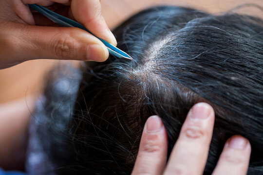 Head and shoulders portrait of  beautiful Mixed-Race woman plucking eyebrows looking in mirror during morning routine, copy space