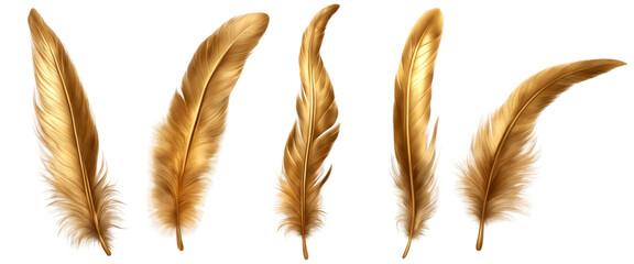Five detailed golden feathers with varying shapes and textures isolate on transparent background, cutout, png