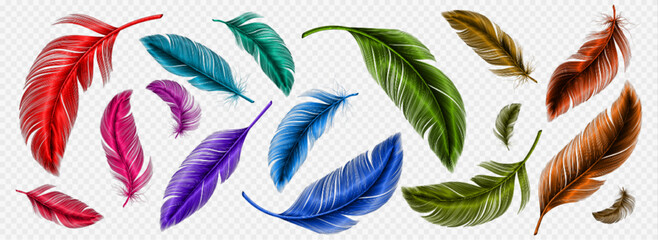 Color feathers, soft bird plumage isolated on transparent background. Red, pink, blue and green fluffy lightweight quills, bright colored feathers, vector realistic illustration
