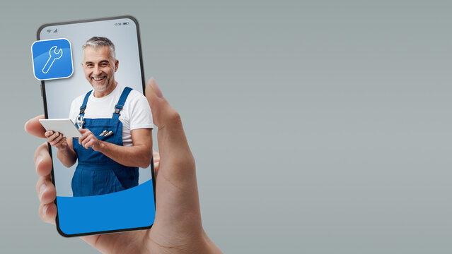 plumbing services - plumber with wrench showing phone call gesture on blue background with copy space