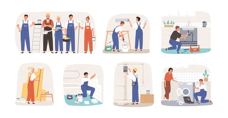 set mix race professional repairmen in uniform making house renovation home maintenance repair service concept full length horizontal isolated vector illustration