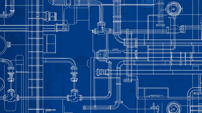 Industrial piping layout with blue background and technical drawings.