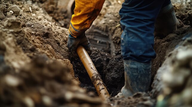 Skilled male worker in blue uniform and orange gloves is repairing a pipe in a trench, surrounded by construction equipment and muddy terrain, showcasing dedication to plumbing work