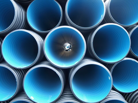 Construction site with a blue pipe in the trench, framed by wooden supports and earth. Infrastructure under construction, building foundation.