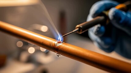 Solder wire melting smoothly around a copper pipes pinhole leak during emergency plumbing maintenance indoors.