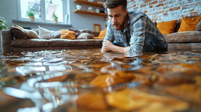An upset man crouches in his flooded living room, inspecting the severe water damage caused by a leaking roof or pipe rupture.
