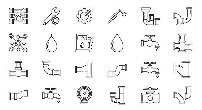 Set of clean, modern, and editable line icons representing various aspects of pipeline maintenance, including welding, system checks, faucets, gas and oil industry symbols, water supply, plumbing