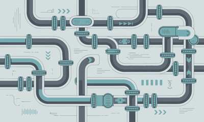 Pipelines textured background with copy space. Industrial vector banner with pipes and equipment.
