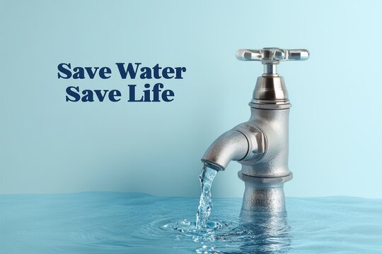 Water conservation concept with faucet pouring clean water in a blue background