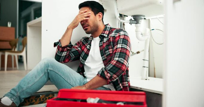 Frustrated man, plumber and headache with problem, fail or mistake on maintenance, repair or pipe by sink. Upset male person or handyman with plumbing issue, leakage or broken faucet by basin at home