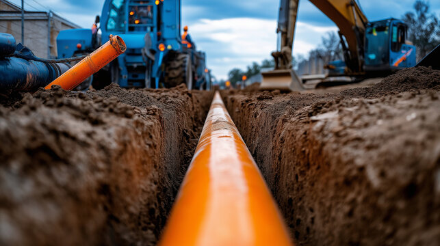 A combination of orange and blue pipes laid parallel in a trench, surrounded by freshly dug earth and construction tools.