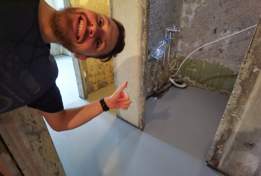 A construction site showing newly installed blue and red plumbing pipes laid in a trench, ready for connections and further work.