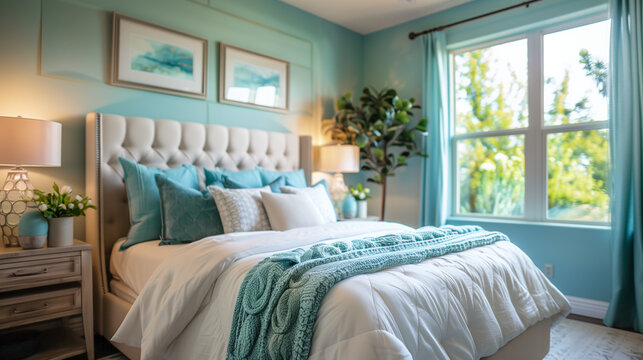 A tranquil bedroom with a comfortable bed, calming shades of blue and teal accents.