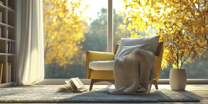 A cozy nook for reading with a plush chair, blanket, and natural light streaming in, relaxation vibe,