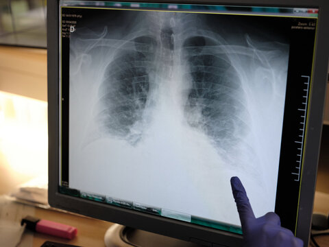 chest xray film of the patient with pneumonia right lower lung. Covid-19 pneumonia. Covid lung infection.
