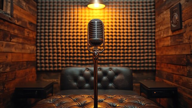 61) Picture a modern soundproof booth for recording voiceovers or podcast segments in an ad agency. The interior has acoustic foam panels in a geometric pattern, and a microphone stands at the