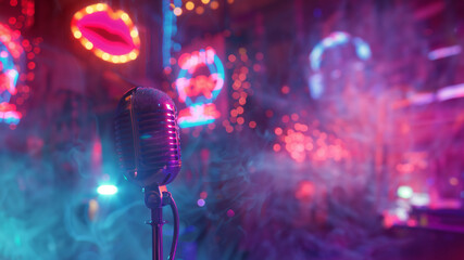 Beautiful vintage microphone on stand against blurred background of colorful neon lights, bright signs and smoke. Bright purple background concept with mic and empty space to place concert ad text