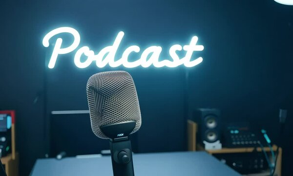 The camera captures a black and gold podcast microphone on a sleek stand in a high-end broadcasting studio. In the background, 'Podcast' glows in neon lights (mov)