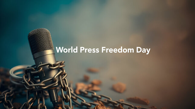 Two podcast microphones wrapped tightly in metal chains, one in top left, one in bottom right, blue background, bold text 'World Press Freedom Day' in center, cinematic, realistic, symbolic.